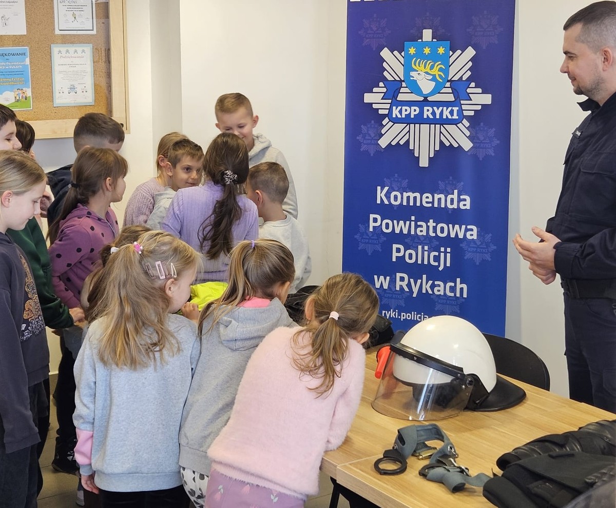 Wczoraj Komendę Powiatową Policji w Rykach odwiedzili wyjątkowi goście – uczniowie Zespołu Placówek Oświatowych w Światach. Wizyta była doskonałą okazją do przybliżenia dzieciom specyfiki służby w Policji oraz codziennych zadań realizowanych przez funkcjonariuszy i funkcjonariuszki. Nie zabrakło także ważnych informacji dotyczących bezpieczeństwa, ze szczególnym uwzględnieniem zasad bezpiecznego spędzania czasu podczas zbliżających się ferii zimowych.